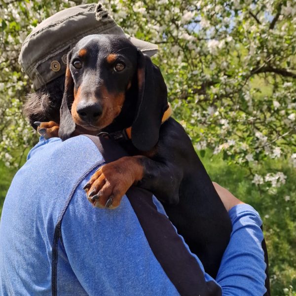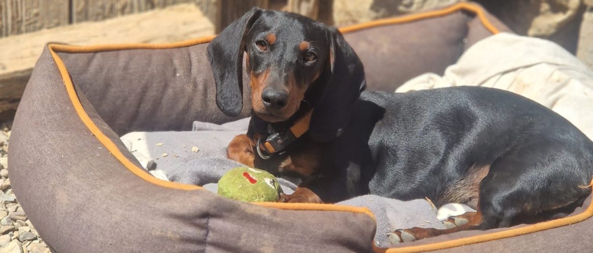 Dackel Gustav liebt Menschen über alles und möchte am liebsten 24/7 in der Nähe seiner Bezugspersonen sein und kann daher noch nicht alleine bleiben! Das sollte weiterhin trainiert werden 🐕
